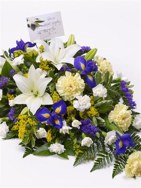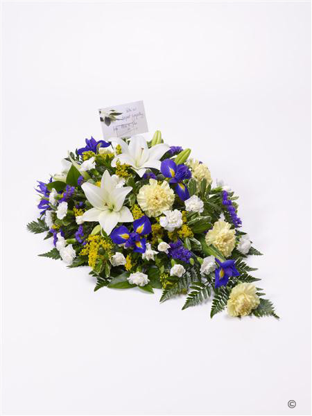 Asiatic Lily and carnations are presented with irises, spray carnations and choice foliage to create this lemon and blue teardrop spray.