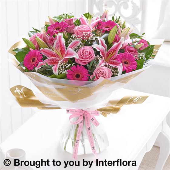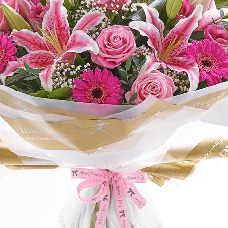 Featuring pink Oriental lily, pink large-headed roses, cerise germinis and pink lisianthus, hand-tied with gypsophila, aspidistra leaves, eucalyptus and salal, wrapped and trimmed with 'Happy Mother's Day' ribbon and presented in Interflora Gift Packaging.