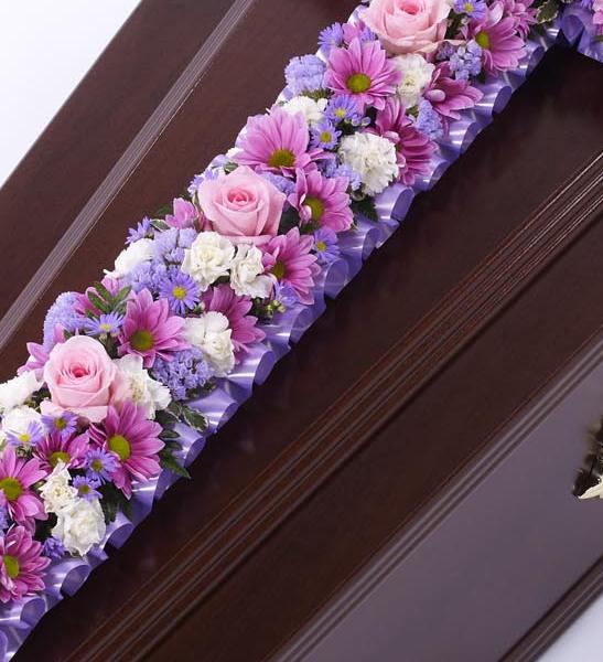 A classic cross covered with a mass of pink and lilac flowers including roses, spray carnations, spray chrysanthemums and September flower. Approximate height 153cm (5ft).