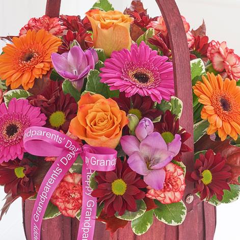 Featuring orange spray carnations, red spray chrysanthemum, orange germini, cerise germini, orange large headed roses and cerise freesia with salal, pittosporum and red oak leaves, presented in a mulberry wash driftwood basket trimmed with ‘Happy Grandparents' Day’ ribbon.