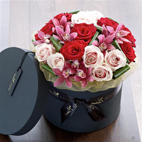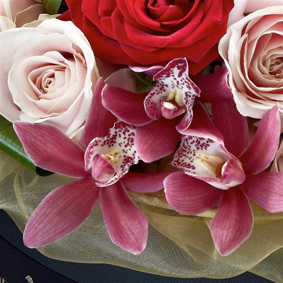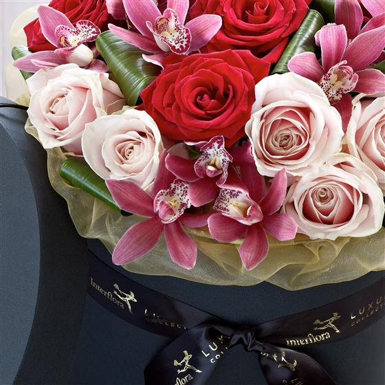 Featuring the very freshest large headed roses in red and pale pink shades, exotic pink mini cymbidium orchids and green aspidistra, expertly arranged in a stylish black hatbox and presented in luxurious packaging for maximum impact when your gift is delivered.