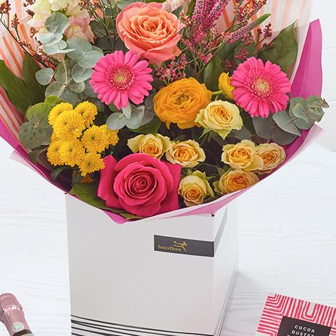 An exquisite bright handmade bouquet, plus a selection of scrumptious chocolates and a mini bottle of rosé prosecco.