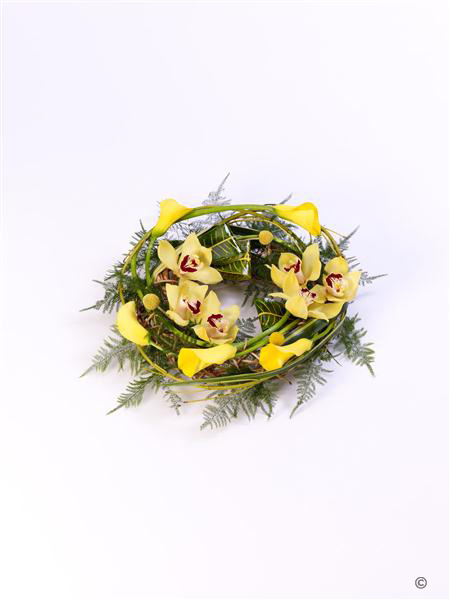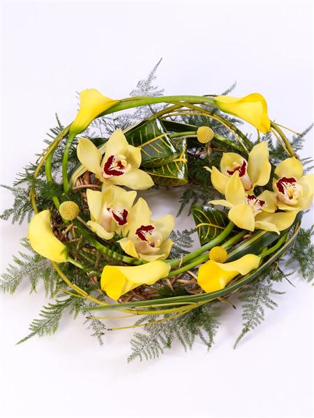 Yellow calla Lily and cymbidium orchids are entwined with cornus Stems, craspedia and asparagus fern around a circular willow frame to create this woodland wreath. Approximate diameter 40cm (15 inches).